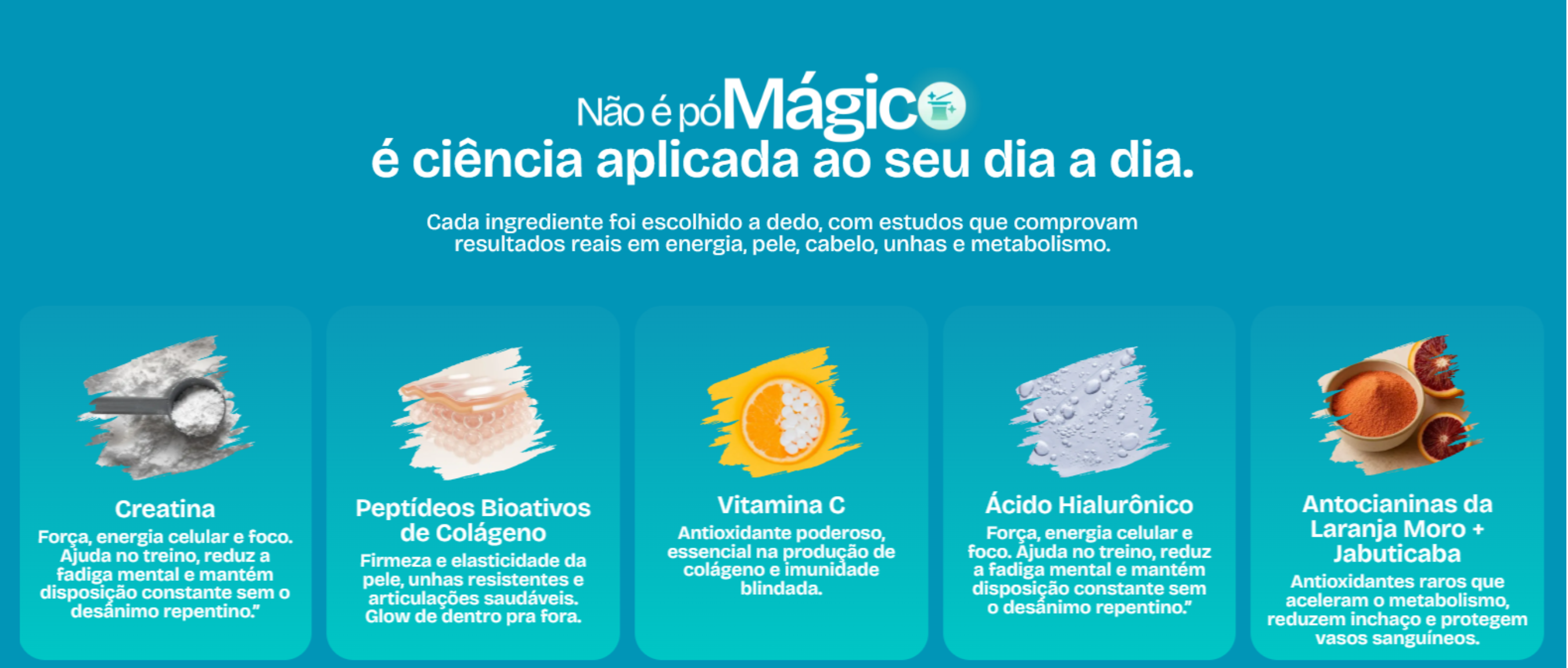 - Colágeno (2kDa) + Ácido Hialurônico: É o seu tratamento estrutural. Garante Pele mais Firme, com mais viço e hidratação. Cabelos e unhas mais fortes.