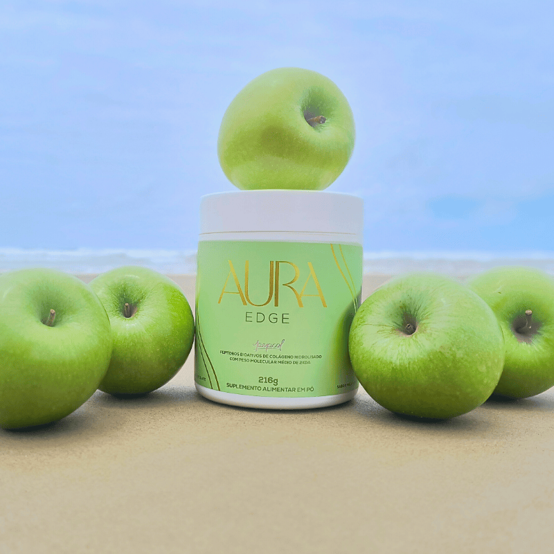 O que ele é: O Aura Edge é um suplemento em pó que combina 7 ativos essenciais em uma única dose diária (1 scoop). Ele tem um sabor delicioso de Maçã Verde, o que torna fácil incluí-lo na sua rotina.