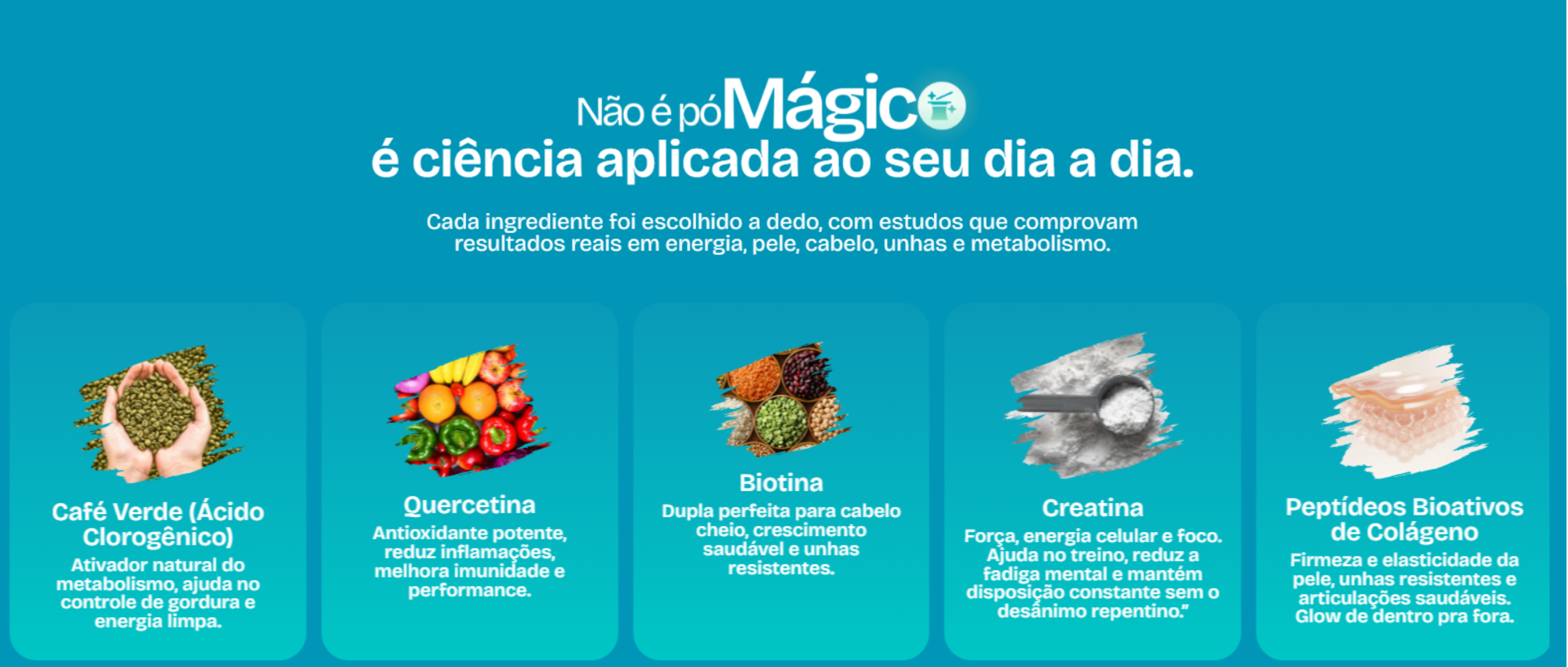 O que ele é: O Aura Edge é um suplemento em pó que combina 7 ativos essenciais em uma única dose diária (1 scoop). Ele tem um sabor delicioso de Maçã Verde, o que torna fácil incluí-lo na sua rotina.